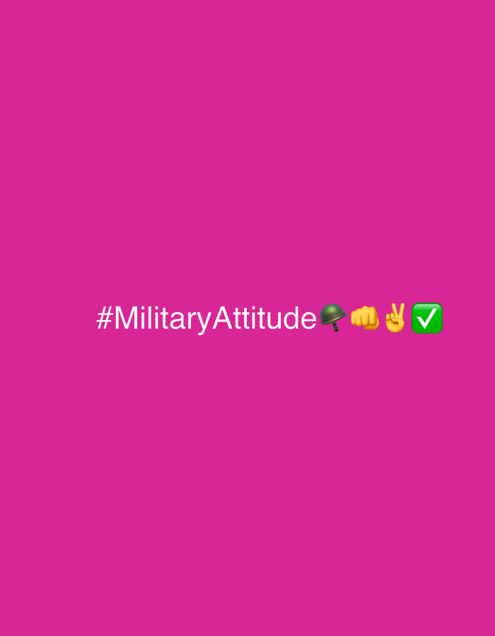 The image depicts a solid magenta background. Centered on this background is the white text "#MilitaryAttitude". To the right of the text, from left to right, are four emojis: a dark green military helmet, a yellow clenched fist, a yellow peace sign hand, and a green square checkmark. No discernible physical location, individuals, or environmental elements such as those in Zaki Biyem, Nigeria, are present within the image. No actions or interactions are depicted.