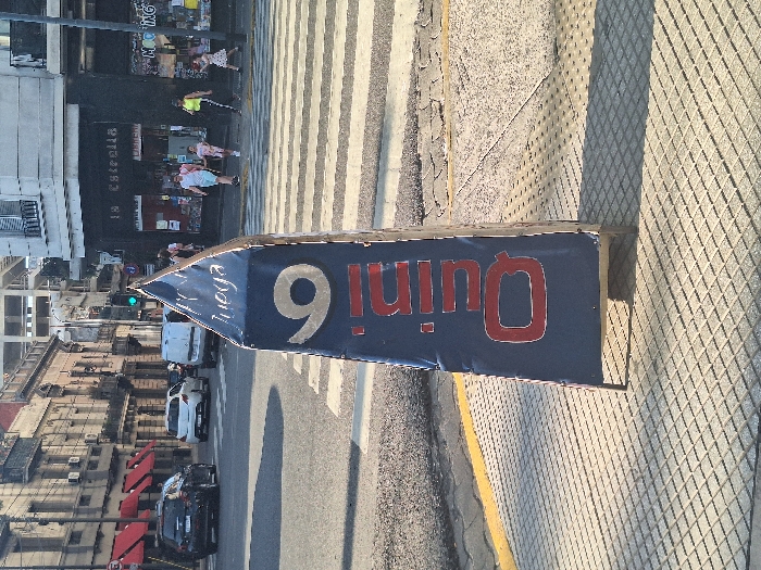 A street scene depicts a crosswalk with a blue sign that reads "Quini 6." Buildings line the street with cars driving. Pedestrians are visible on the sidewalk near a store named "la estrella." The sign is positioned on the edge of the sidewalk and road.