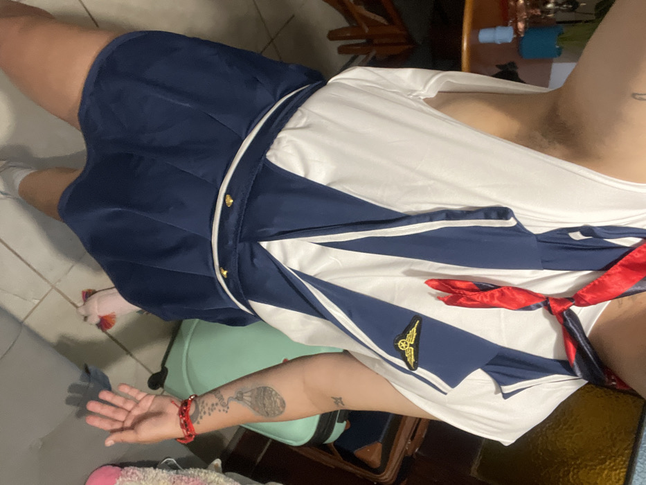 The scene depicts an indoor residential setting in Arica, Chile. A single individual is centrally positioned, observed from the upper chest to mid-thigh, facing the camera. The individual wears a costume resembling an airline uniform, comprising a white sleeveless top with a dark blue V-neck overlay featuring white pinstripes. A yellow and black winged insignia is affixed to the left chest area. A red and dark blue patterned scarf is tied around the neck. A white belt with three golden circular studs encircles the waist, above a dark blue pleated mini-skirt. White socks are visible on the feet. The individual's left armpit shows visible hair. The right forearm displays a tattoo of a hot air balloon with descending shapes, and a red string bracelet is worn on the right wrist. In the background to the left, a wooden table holds a teal potted plant and a small blue object. To the right, two suitcases are stacked: a brown case on top of a smaller light blue wheeled case. A partially visible pink fluffy object is in the far right. The floor is covered with light-colored tiles. The scene is illuminated by artificial interior lighting.