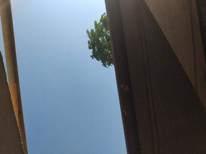 The image depicts an outdoor scene in Barden Yana, Nigeria, captured from a low vantage point looking upwards. The upper portion of the frame is dominated by a clear, light blue sky, indicating bright daylight conditions. In the upper right quadrant, the green foliage of a tree is visible against the sky. The lower half of the image is occupied by a dark brown, coarse-mesh fabric, likely a canopy or awning, which angles downwards from left to right. Along the top edge of this fabric, several irregular, lighter brown discolored patches are present. Above the fabric, two horizontal or slightly angled bars are partially visible: a wider, light brown bar with darker streaks in the upper left, and a thinner, darker bar positioned directly above the fabric. No individuals, animals, or direct actions are discernible within the frame.