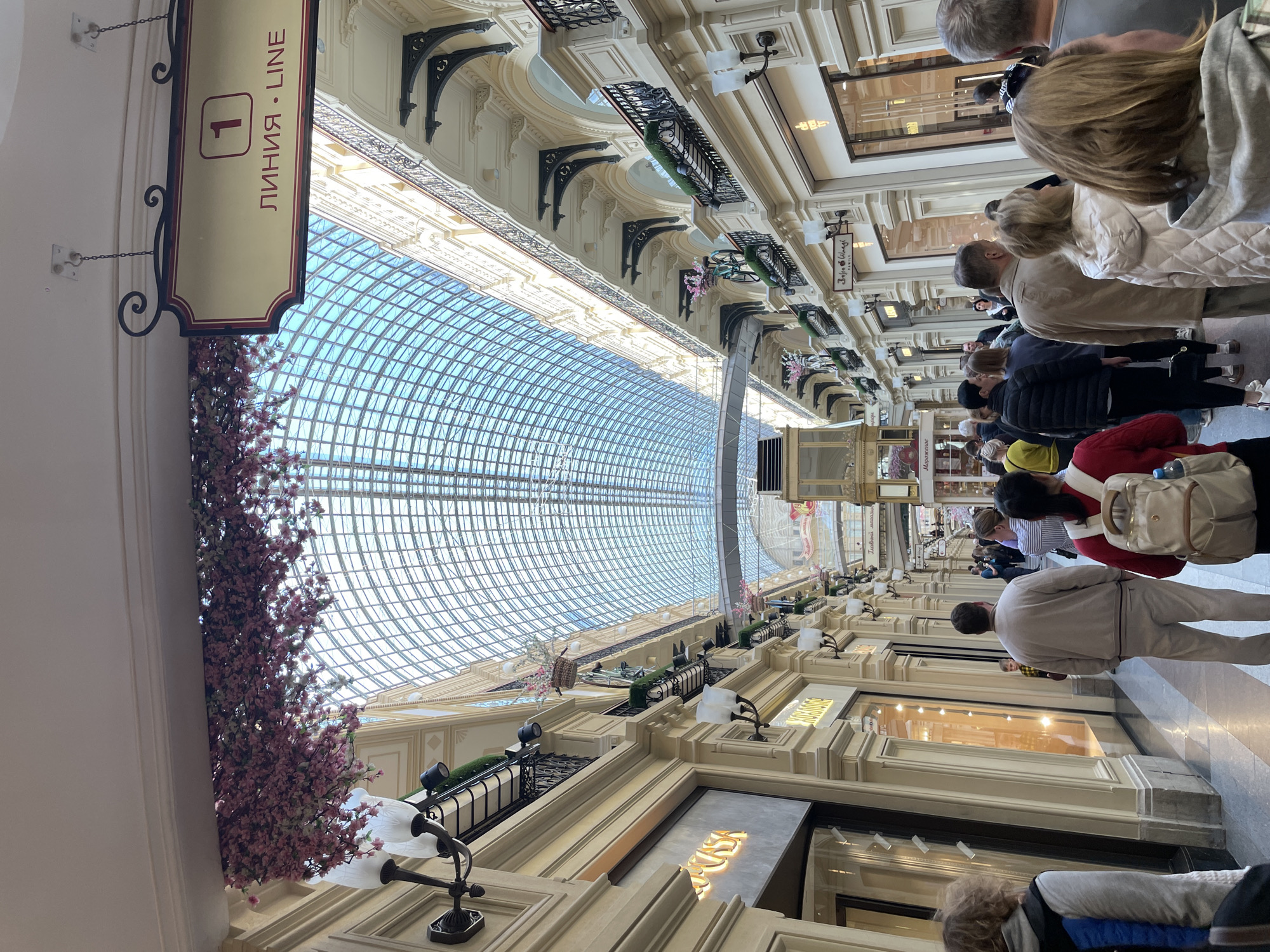 n interior view of GUM, a famous department store in Moscow, Russia, not Khimki. The photograph, taken from a low angle looking upwards, captures the store's interior architecture, highlighted by a large, arched glass ceiling providing natural light. The walls on either side are decorated with ornate architectural details, including moldings, brackets, and wrought-iron balconies with greenery. Cherry blossom decorations are present. Several people are walking through the store. They appear to be tourists or shoppers. They are walking along the passageways. A sign with "1" and the Russian word "ЛИНИЯ" ("line") is prominently displayed in the foreground. Storefronts of various shops are visible along the sides.