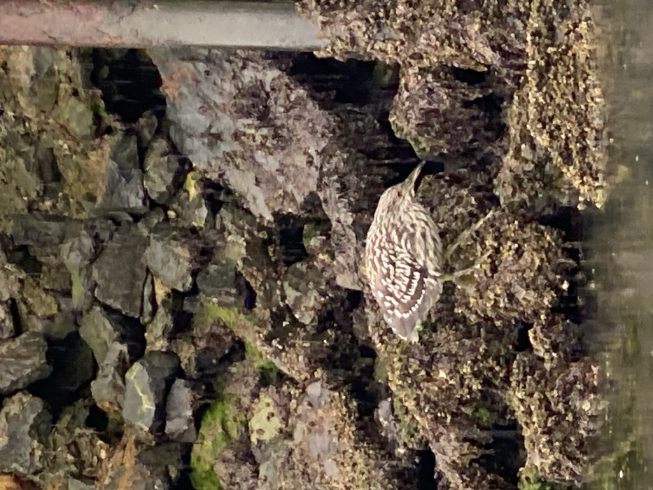 A mottled brown and white bird clings to a textured, rocky surface. The bird's plumage blends with its surroundings, aiding in camouflage. A metal pipe runs horizontally along the top of the frame. Some dark crevices are visible amongst the rocks. Patches of green moss cling to the stones, adding to the natural, weathered appearance of the rock face. A body of water is visible on the extreme right edge of the frame.
