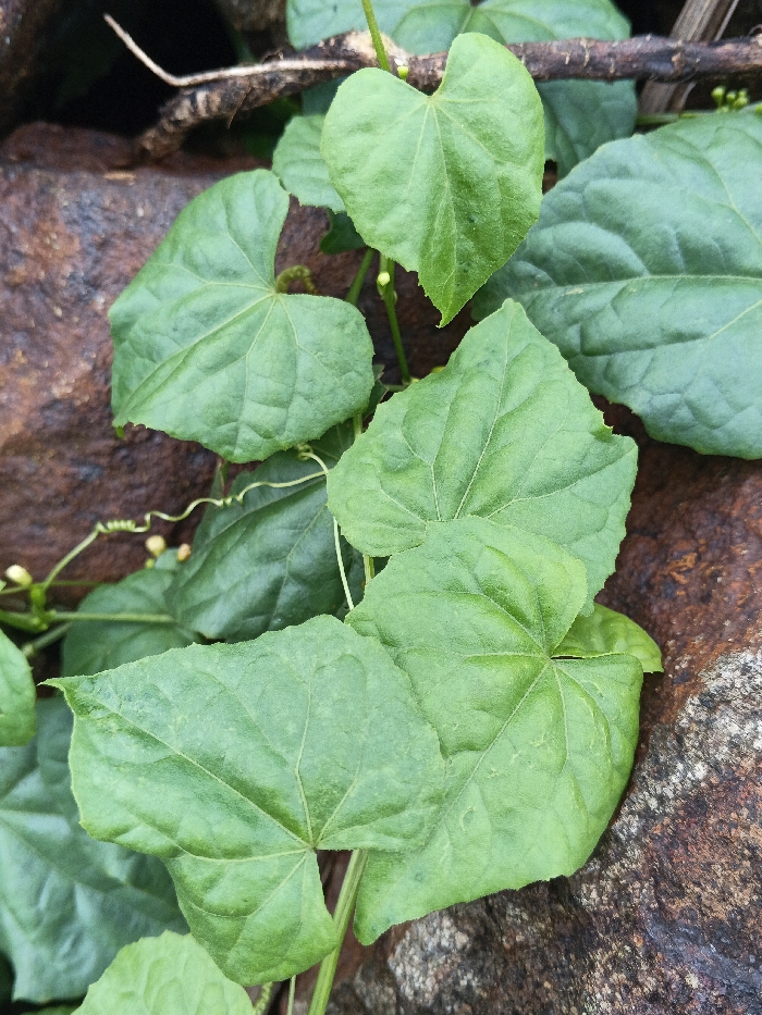 A vibrant green ivy with heart-shaped leaves climbs a weathered stone surface. The leaves display intricate vein patterns and slight imperfections along their edges. A slender vine, equipped with delicate tendrils, reaches out from the foliage. The juxtaposition of the lush greenery against the rough, textured stone creates a natural contrast.