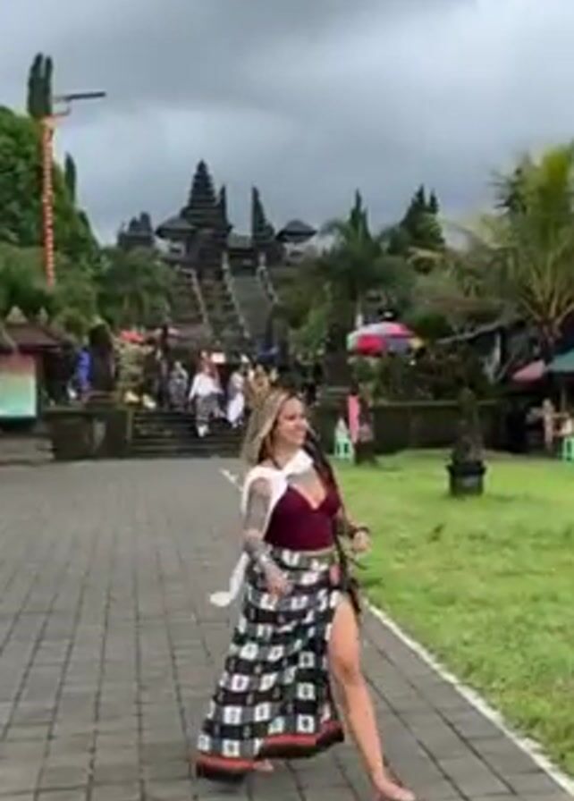 A woman with blond hair and a burgundy top walks on a stone path towards a Balinese temple