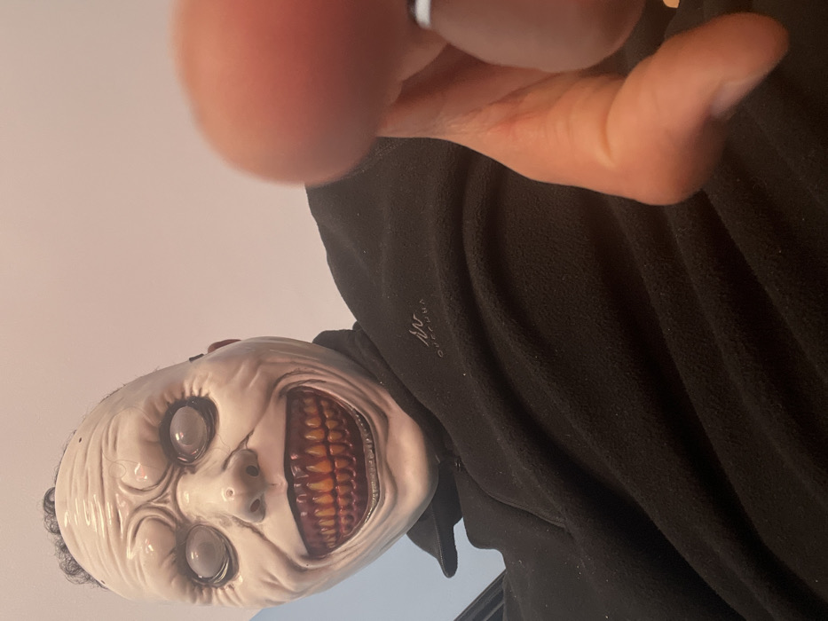 The image depicts a single individual positioned in an indeterminate indoor setting in Ouaouizert, Morocco. The person is wearing a pale, off-white full-face mask featuring a wide, unsettling grin with dark orange-brown teeth and red gums, large vacant eye lenses, and prominent facial wrinkles. Dark, curly hair is visible above the mask. The individual is dressed in a dark-colored, possibly black or dark blue, zippered fleece jacket with the brand "QUECHUA" visible on the left chest. The right hand of the individual is extended towards the camera, with the index finger blurred and prominent in the foreground. A silver-colored ring is present on the ring finger of the extended hand. The background is a plain, light-colored surface, transitioning from light grey/white to a faint pinkish tone, with a slight blue tint on the left. The subject is directly engaging the camera.