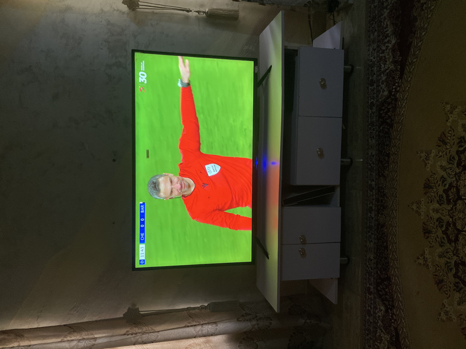 This image depicts an indoor scene within the city of Panshekara, Nigeria, centered on a television displaying a football match. A large, black-framed flat-screen television rests on a light-colored, multi-compartment TV stand. The television screen shows a male referee, viewed from the chest up, with graying hair, wearing a red long-sleeved shirt with a UEFA Champions League patch on the left sleeve. He has a slight smile and extends his right arm horizontally, palm open. The background on the screen is a green football pitch. A digital scoreboard in the upper left corner displays "11:43 CHE 0 0 BAR," and a "30 YEARS OF UEFA CHAMPIONS LEAGUE" logo is visible in the upper right. The TV stand features two cabinet doors with round, gold-colored knobs on the left side, an open shelf in the center, and two drawers with similar knobs on the right. The stand is elevated by short, metallic legs. The floor beneath the TV stand is tiled and partially covered by a patterned rug featuring dark brown and light beige/gold intricate designs. The walls appear to be a light, textured gray or off-white. Light-colored curtains with vertical patterns are visible on the left side of the frame, and a decorative tassel hangs on the right. The room is dimly lit, with the television screen providing the primary light source, casting a green hue onto the TV stand.