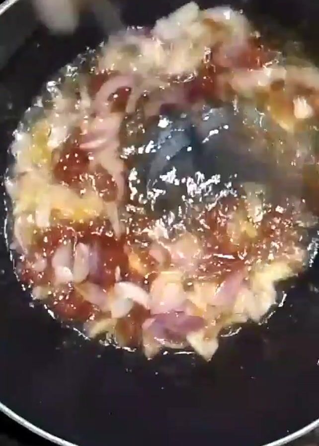 Inside a black pan, a person is using a cooking utensil to stir-fry sliced onions in oil. A reddish paste is also present in the pan and is being mixed with the onions. The oil is sizzling.