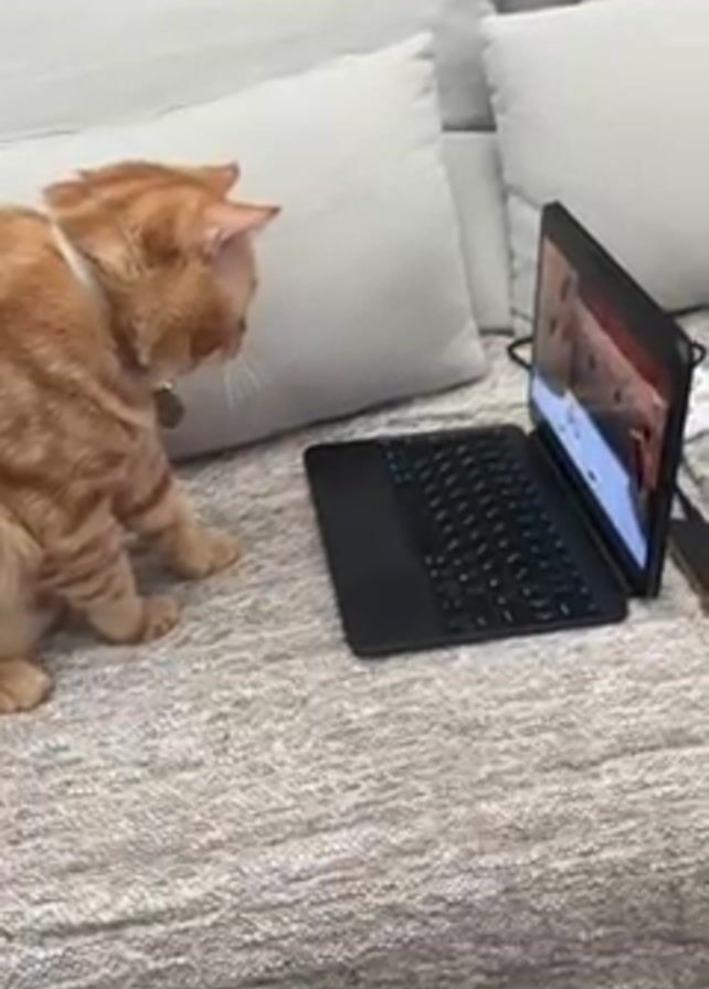 An orange cat in a white collar stands on a light-colored, textured couch, fixated on a tablet computer propped open with a keyboard attached. The screen shows a reddish-brown image, and the cat stares intently with its ears perked up. White, rectangular pillows sit behind the tablet.