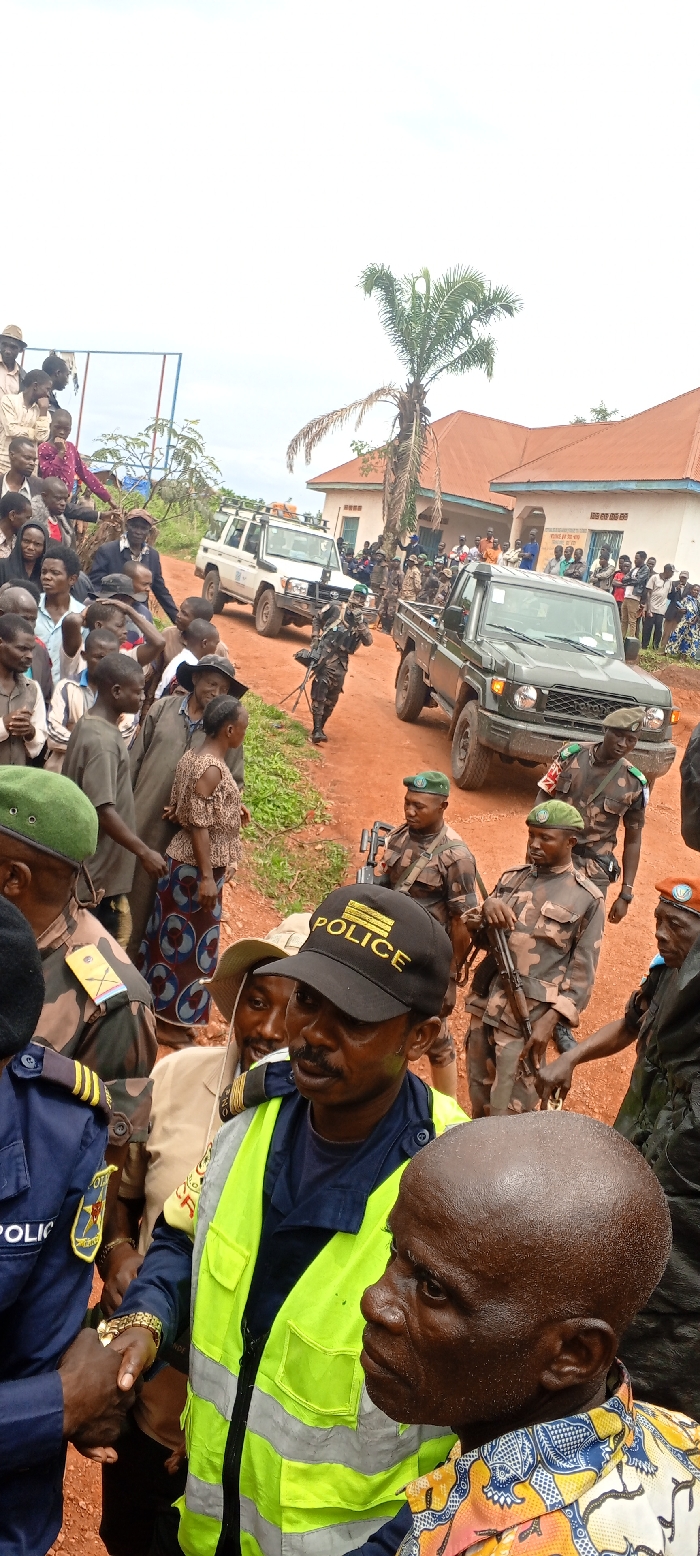 A crowd of people gathers on a red dirt road. Camouflaged military personnel, some armed with rifles, stand among them. Two military vehicles are visible in the background. A man in a "POLICE" hat and a neon vest is shaking hands with another man in a navy uniform with the word "POLICE" visible. A palm tree and low-rise buildings appear in the distance.