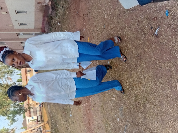 Two women stand side-by-side outdoors. Both wear white button-down shirts and blue pants. The woman on the right gazes toward the camera. The woman on the left looks to her side. They stand on dry, brown grassy ground. A building is visible in the background. Both are wearing sandals.