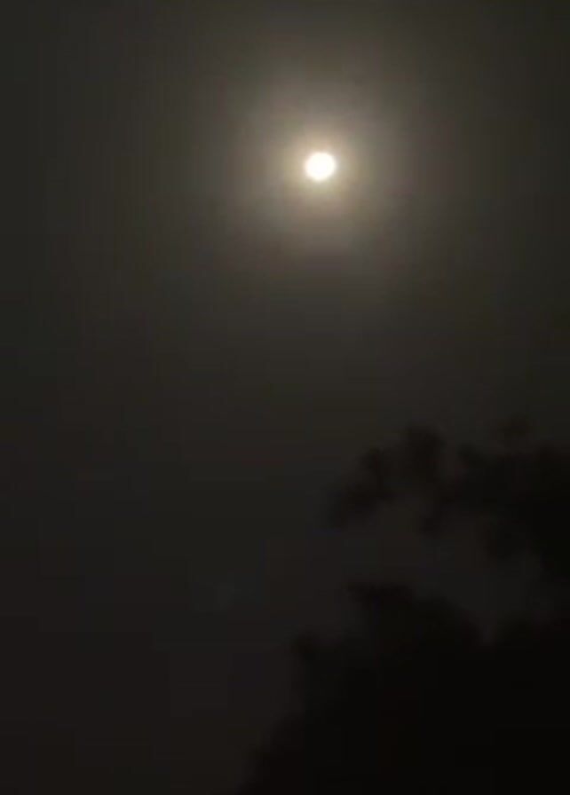 moon at night, shrouded in a hazy glow. Silhouetted tree branches are visible at the bottom of the frame. The camera angle is tilted upwards, focusing solely on the celestial body and its immediate surroundings.
