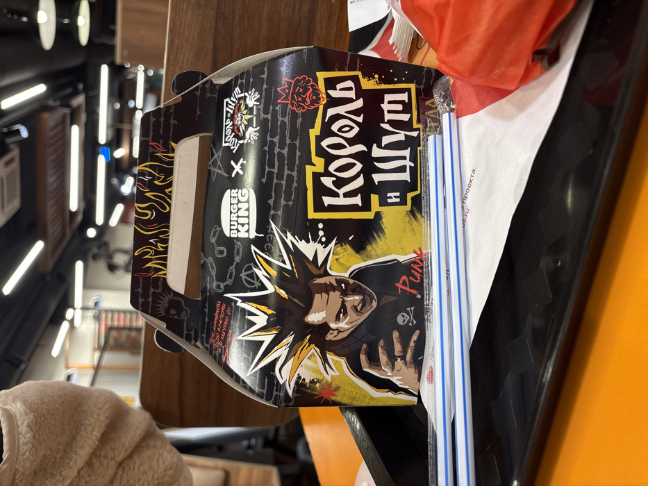 A Burger King box with a design featuring a punk rock aesthetic. The box is predominantly black, adorned with graphics including a stylized illustration of a person with a mohawk and a skull-and-crossbones symbol. The words "Король и Шут" are visible in a yellow and black font. The box sits on a black tray along with white and blue straws and other items. The background shows a room with bright overhead lights.