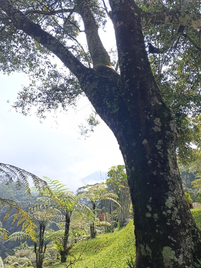 A large, moss-covered tree trunk dominates the right of the frame, its branches extending overhead. In the distance, a mountain peak is visible under a hazy sky. Green tree ferns dot the landscape, creating a lush, verdant scene. A small stand of bamboo can be seen amongst the ferns. The perspective is from below, emphasizing the height of the tree and the depth of the landscape.