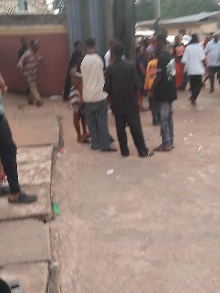 A medium shot captures a gathering of people outdoors. A small group is clustered near the center, while others are seen in the background. The ground appears to be a dirt surface with scattered debris. The scene is somewhat obscured by the angle and lack of focus, but it gives a glimpse into a busy public space. The lighting is diffused, casting soft shadows.
