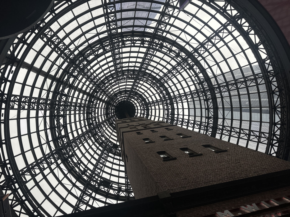 A tall, brown brick tower rises up into a circular, metal-framed dome structure