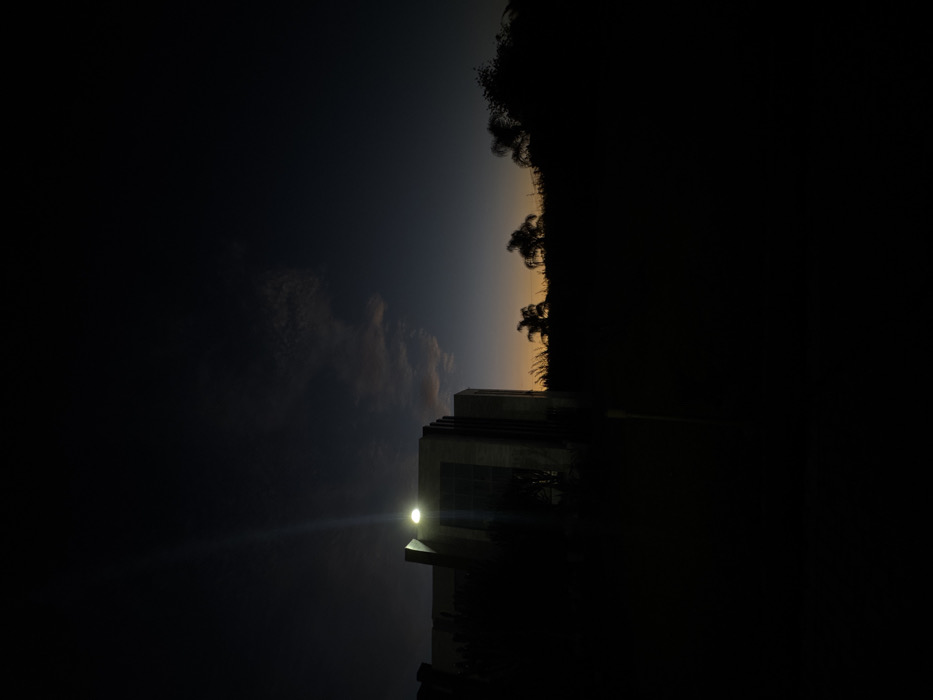 The image depicts an outdoor scene in Majjate, Morocco, at either dawn or dusk. The sky transitions from a dark navy or black at the zenith to an orange-yellow glow along the horizon. Sparse, faint clouds are visible in the upper-left quadrant. On the left side of the frame, a multi-story, light-colored building with a modern, angular architectural design is partially visible. A bright artificial light source, likely a floodlight or streetlamp, is mounted on the building's upper facade, emitting a strong vertical beam of light upwards. The foreground and middle ground are largely unilluminated, appearing as dark silhouettes of vegetation. Several palm trees and dense foliage are distinctly silhouetted against the illuminated horizon in the mid-distance. No individuals, actions, or direct interactions are discernible within the frame. The environment combines artificial structures with natural elements under low-light conditions.
