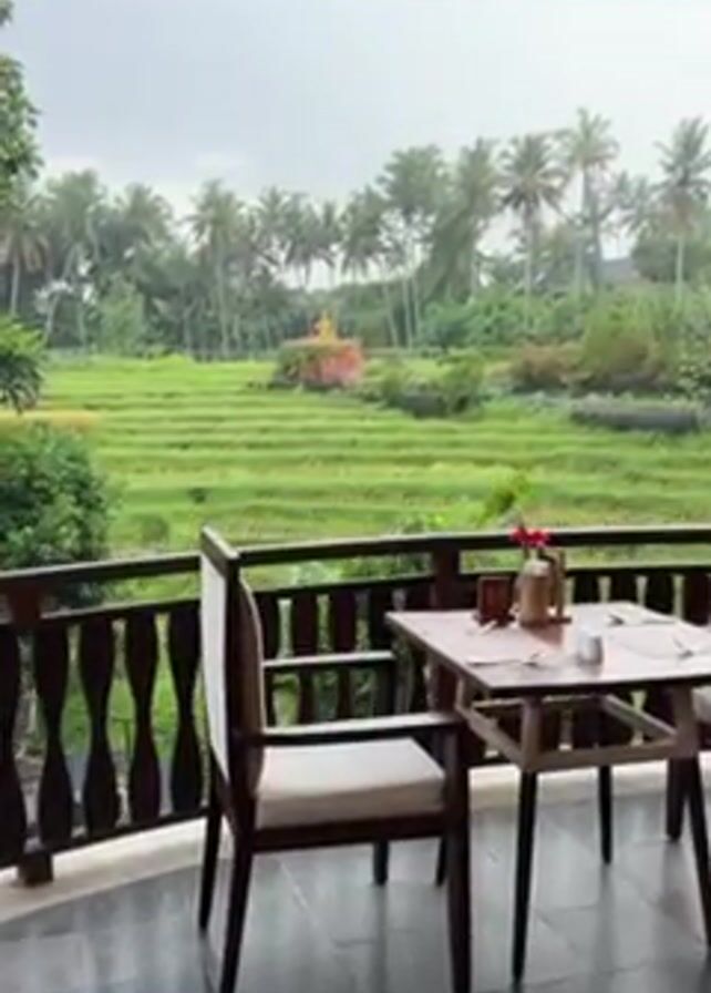 n outdoor dining area on a balcony overlooking a lush, green rice field with palm trees in the background