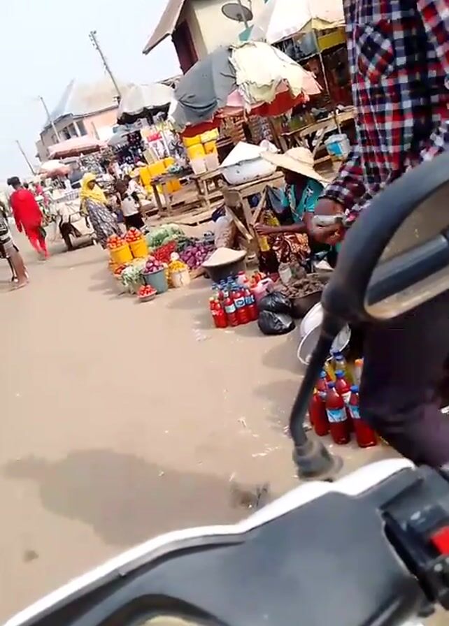 street scene, likely in a marketplace, from the perspective of a person on a scooter
