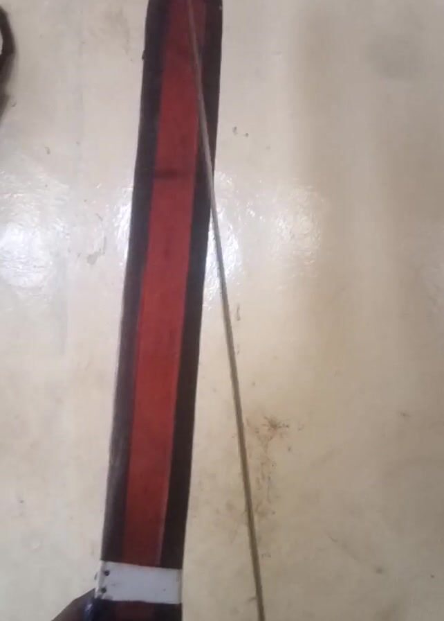 A person holding a machete and its sheath over a white surface. The machete is silver, and the sheath is red, brown, and white. The person removes the machete from the sheath.