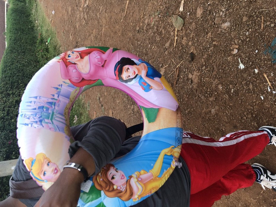 A person is sitting outside, holding an inflatable swim ring decorated with Disney princesses
