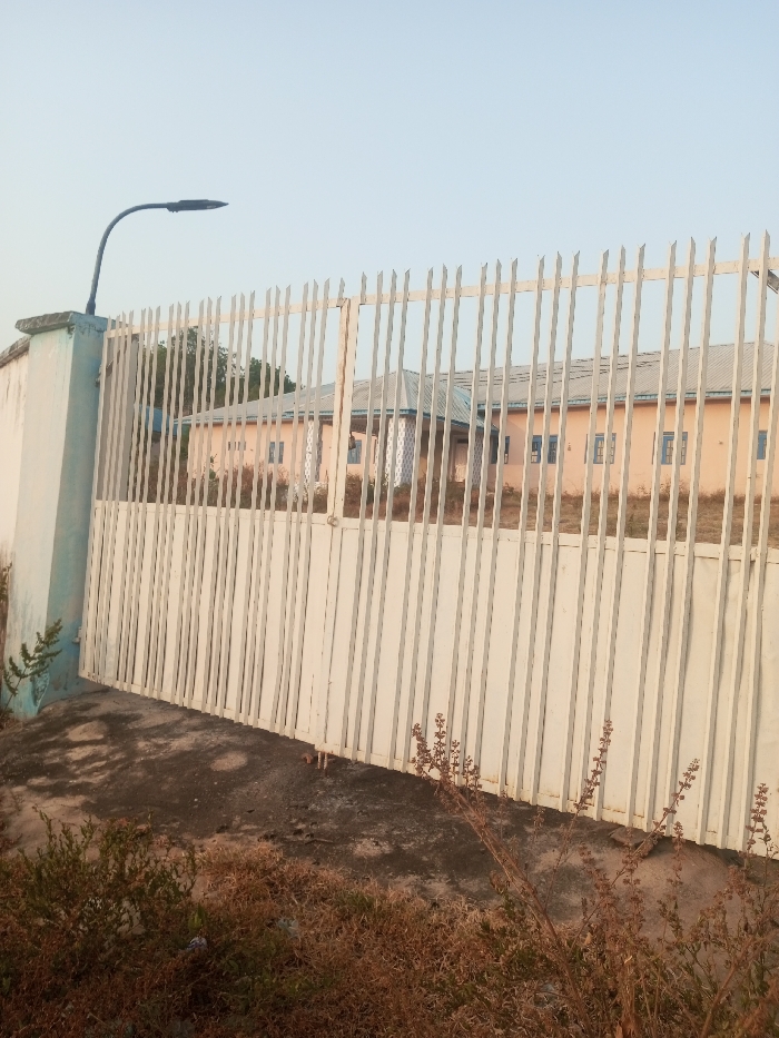 The image captures a ground-level view of a fenced property entrance in Okeni, Nigeria, under clear daylight conditions