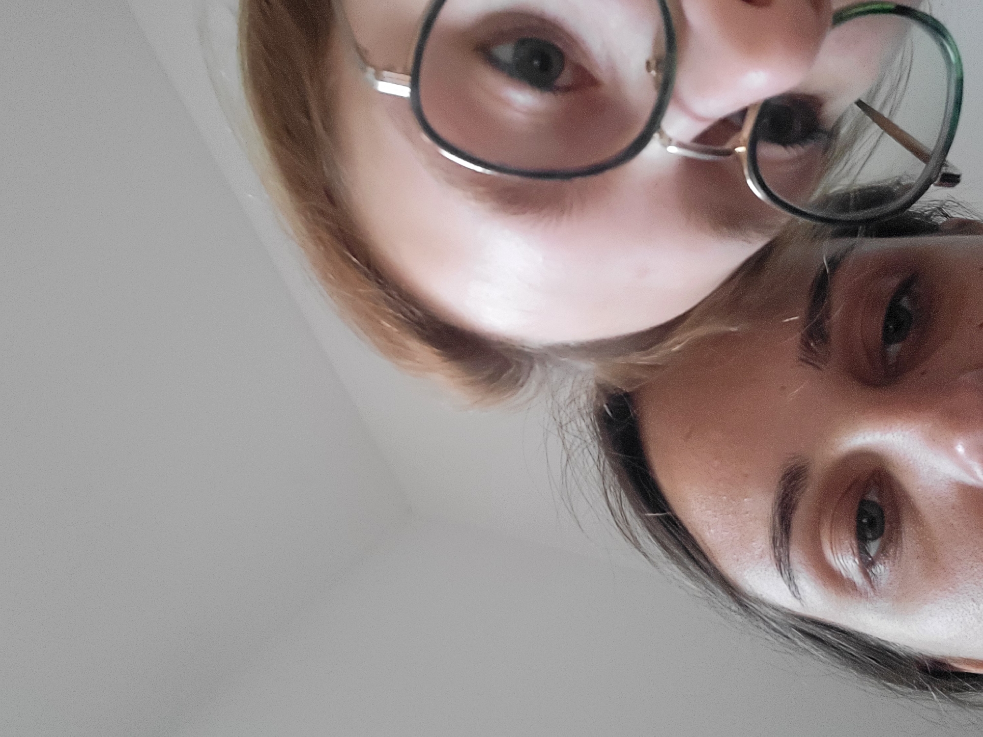 The image presents a close-up, low-angle view of the upper facial features of two individuals against a plain, light grey background. The individual positioned diagonally from the upper right exhibits light brown hair and wears round, thin-framed metal glasses. Their right eye, with a dark pupil, is visible through the right lens, which reflects a vertical, light-colored linear object. The second individual, occupying the lower-left portion of the frame, has dark brown hair and a visible left eye with a dark pupil and iris, framed by a dark, defined eyebrow. No discernible actions or interactions are taking place. The background is uniformly light, consistent with an interior wall or ceiling. There are no visual cues present within the image to determine a specific location within the city of Kragujevac, Serbia.