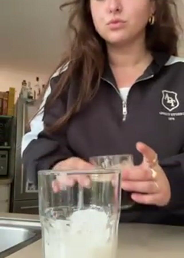 A woman with dark hair and a black zip-up jacket is shown pouring coffee into a glass filled with ice and a white liquid. The woman has multiple rings on her fingers and is wearing hoop earrings. The scene appears to be in a kitchen, with a sink visible to the left and a kitchen counter in the foreground. The woman pours the coffee slowly, allowing it to mix with the ice and white liquid. The kitchen is cluttered with various items in the background.