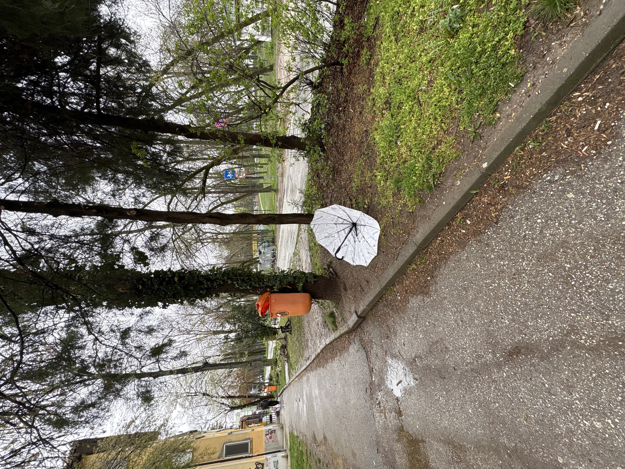 The image depicts a street scene in Kragujevac, Serbia. The view looks along a narrow sidewalk. A tree with ivy is on the left and in the center of the frame. An orange trash bin is attached to the tree. To the right of the tree, on the sidewalk, lies an open white umbrella. The sidewalk continues down the street with trees lining either side. Buildings are on the left side of the street, and greenery on the right. The scene suggests an overcast or wet day. The sidewalk is gray, and evidence of moisture is visible. Further down the path are various signs, including a red traffic sign and a blue speed limit sign.