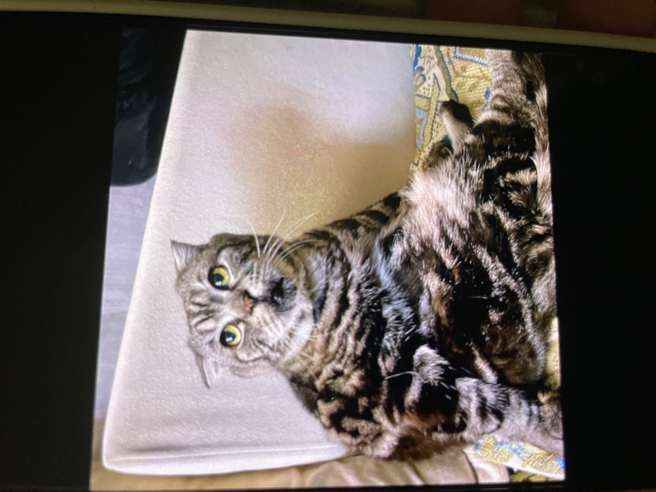A tabby cat with wide yellow eyes and a slightly quizzical expression lies on its back. The cat is mostly brown and black stripes, with some grey mixed in. It is resting on a cream-colored surface, possibly a chair cushion, with patterned fabric underneath. The image appears to be a photograph of a screen displaying the cat photo.