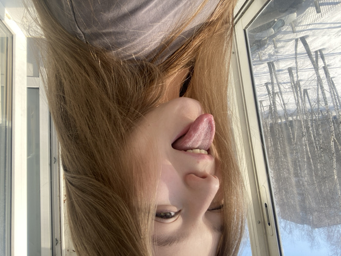 A young female, with long, light brown hair, is captured from the chest up, positioned indoors close to a white window frame. She is wearing a light-colored t-shirt. Her right eye is closed in a wink, and her mouth is open with her tongue extended. Sunlight illuminates her face from the left side. Through the window, an outdoor winter scene is visible, consistent with a residential area in Chaikovsky, Russia. The ground is covered in snow, and numerous bare deciduous trees, likely birches, stand in the foreground. In the background, a multi-story apartment building with a concrete facade is partially visible through the trees. The scene is brightly lit by direct sunlight, casting shadows from the trees onto the snow.