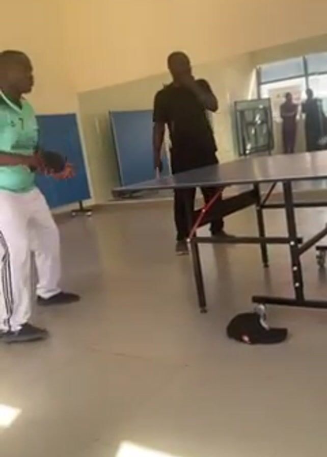 In a well-lit, spacious room with tiled floors and a high ceiling equipped with an air conditioning unit, two men are engaged in a game of table tennis