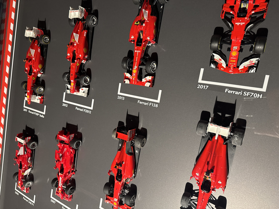 - "This image displays a meticulously arranged indoor exhibition of multiple red Ferrari Formula 1 model cars, situated on a dark grey display surface, indicative of a museum environment such as the Ferrari Museum in Maranello, Italy" by FM-8gYMf1, licensed under CC BY 4.0