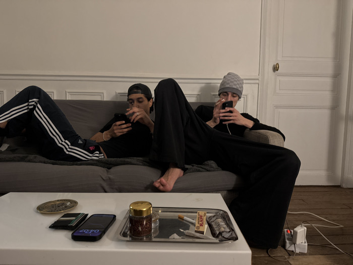 An interior scene depicts two young males reclining on a grey sofa within what appears to be a Parisian apartment, evidenced by white paneled walls and a classic white door with a brass handle