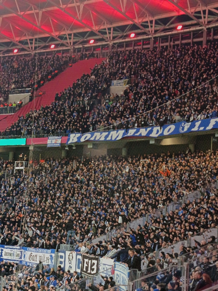 A packed stadium with an overwhelming crowd, mainly wearing dark colors with some blue accents. A large red tarp covers a section of the stands. A banner reading "KOMMANDO" is prominently displayed, with smaller banners visible below. The stadium roof has red lighting. The scene captures a spirited and densely populated sports event.