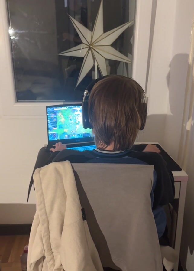 A fair-skinned person with short brown hair sits at a desk, their back to the viewer, playing a computer game on a laptop. They are wearing a blue and black striped top, and headphones. They turn slightly toward the left side of the frame to listen to the unseen speaker. The person is sitting on a grey chair. The laptop is on a small white desk. To the left of the desk, a light beige sweatshirt is hanging from the chair. There is a window behind the player with a star decoration hanging in it. A person is visible in the reflection on the window. The walls are white and the floor is made of brown wood. A bottle of water is on the floor. The camera is static.