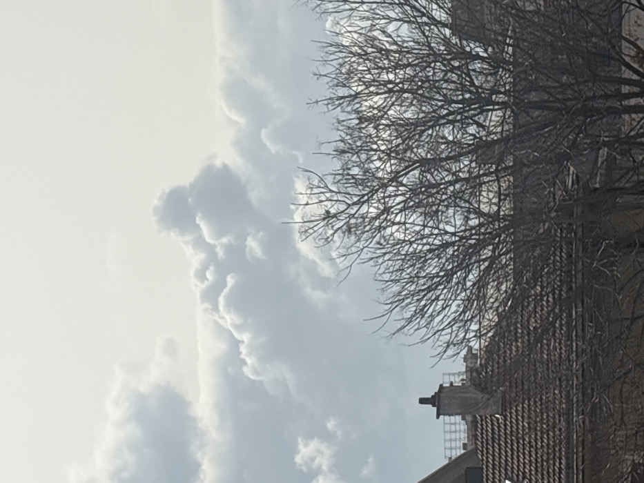 The image presents an elevated view within the city of Plovdiv, Bulgaria, depicting an urban environment beneath a cloudy sky. The upper two-thirds of the frame are dominated by a expanse of white to light-grey cumulus clouds, indicative of daytime with significant cloud cover. In the mid-right and lower portions, a large, leafless deciduous tree stands, its intricate dark branches extending across the view. Below the cloud line and behind the tree, sections of residential architecture are visible. This includes a tiled roof, appearing to be brown or terracotta, in the lower-left quadrant, from which a light-colored chimney with a darker cap protrudes. Further in the background, partially obscured by the tree, a distinct grid-like structural framework is discernible, possibly a building or advertising billboard support. No individuals or specific actions are evident within the scene.