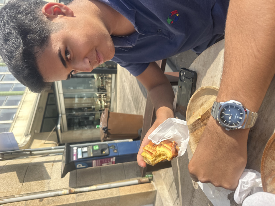 A young male individual is seated outdoors at a light wooden table under direct sunlight in the city of Aldoar, Foz do Douro e Nevogilde, Portugal. He has dark hair and a fair complexion, wearing a navy blue polo shirt with a colorful circular embroidered logo on the left chest. On his left wrist, he wears a silver-toned watch with a blue dial and a metal bracelet. His right hand holds a partially eaten, layered yellow pastry, resembling a *mil-folhas*, wrapped in white paper. His left arm rests on the table, where a small wooden bowl containing crumbs and a black-cased smartphone (likely an iPhone) are also present. The male subject is looking directly towards the viewer with a slight smile. In the background to the left, a blue parking meter with a "P" symbol and a stone-clad building facade are visible. To the right, a brown trash receptacle and a modern building with large glass windows revealing interior cafe seating are present. The scene is brightly lit by natural sunlight, casting distinct shadows.