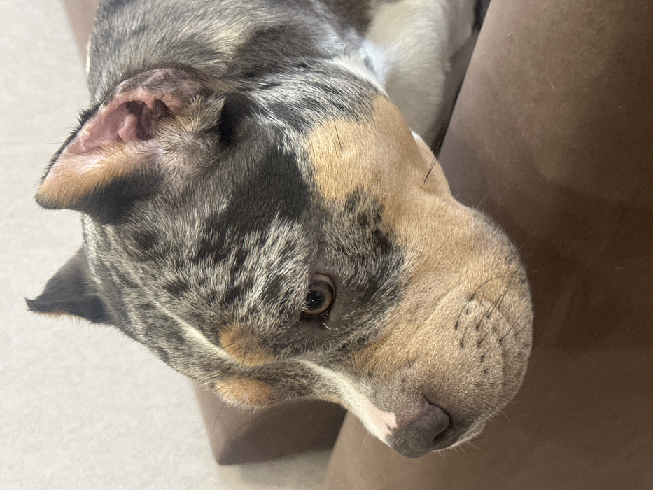 - "A close-up, high-angle profile view depicts a merle-patterned American Bully or similar breed dog, positioned facing towards the left side of the frame" by FM-3Fotg1, licensed under CC BY 4.0