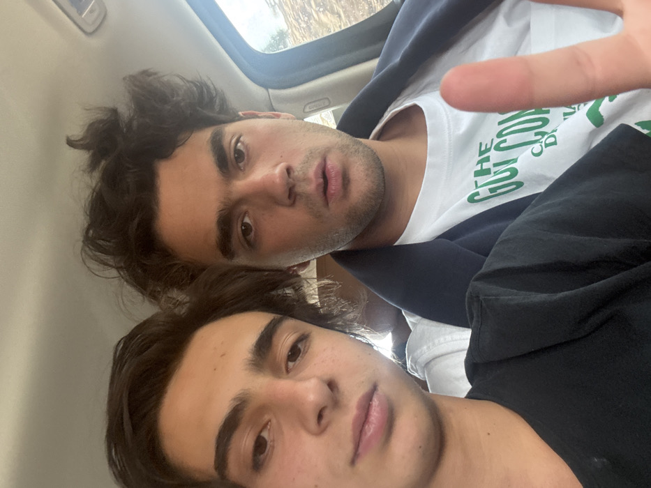 This image displays two young adult males situated inside a vehicle, consistent with a location in Santa Clara Ocoyucan, Mexico. The subject on the left, foregrounded and partially cropped, has dark hair and wears a black V-neck t-shirt. His expression is neutral as he looks directly into the camera. The subject on the right, positioned slightly behind and to the right, has dark, curly, and disheveled hair, with light stubble visible on his face. He wears a white t-shirt with green lettering, partially visible as "THE GUD CO...", and a dark jacket is draped over his shoulders. His mouth is slightly open, and his right hand is raised, forming a "V" gesture with his index and middle fingers. Both individuals are looking directly at the camera. The background visible through the vehicle's window behind the right subject reveals an outdoor environment characterized by dry, light-colored hills and sparse green vegetation, including a single tree. The vehicle interior appears to have light-colored upholstery or headliner material.