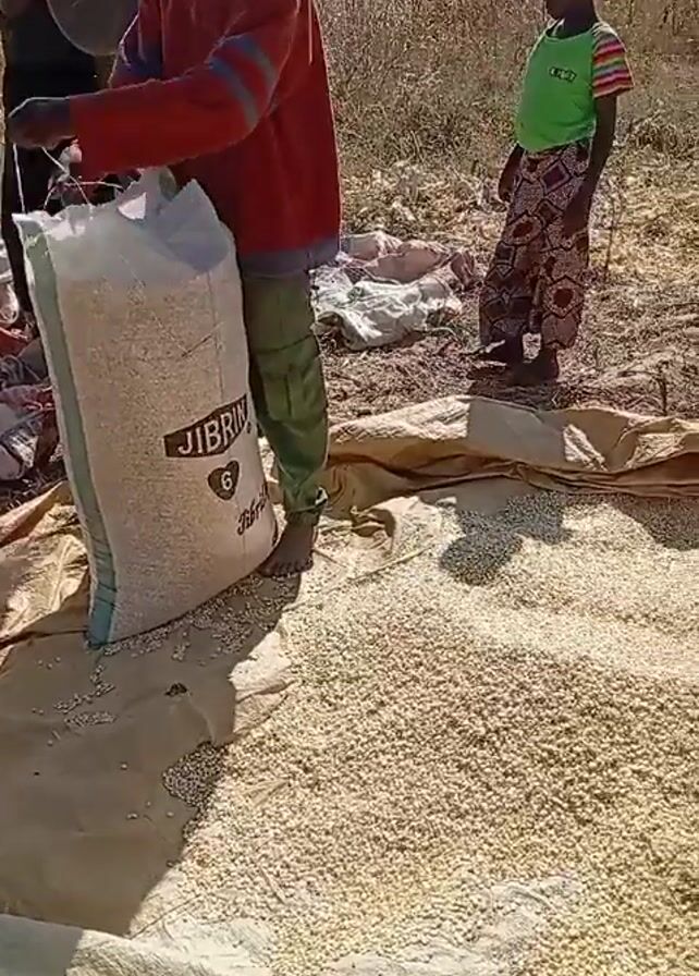In a medium shot, a group of people are working in a field spreading and sorting through what appears to be grains on a large white tarp. The person in the foreground is wearing a red sweater and olive green pants, and is pouring the grains from a large sack labeled "JIBRIN". Another person, partially obscured by the first, is carrying a container on their head. A third person, wearing a green shirt and patterned pants, stands nearby, observing the process. The ground around the tarp is dry and covered with sparse vegetation. The sky is bright, suggesting it is daytime.