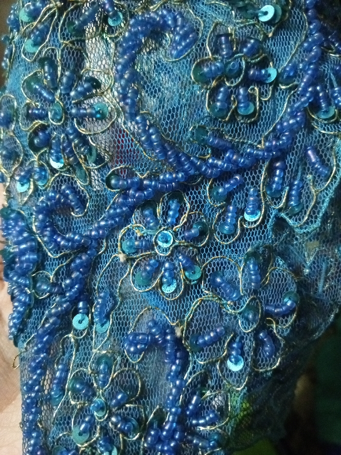 The image displays a detailed close-up of a textile, described as being located in Phakeo, Laos. The primary material is a fine, dark teal-blue netting or lace, serving as a base. This fabric is extensively embellished with intricate beadwork and sequins. Numerous small, translucent royal blue cylindrical beads are meticulously sewn onto the mesh, forming dense, curvilinear patterns, swirling lines, and clusters resembling floral motifs. Interspersed among the beadwork are small, flat, circular, translucent aqua-blue sequins, frequently positioned within the centers of the beaded clusters. A thin, metallic gold-colored thread outlines various decorative elements, providing structural definition to the embellishments. The background behind the textile is out of focus and indistinct, suggesting a shallow depth of field.