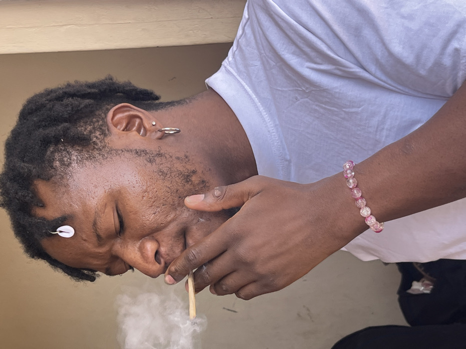 A close-up image captures an adult male in Jos, Nigeria, positioned against a plain, light brown background, suggesting an indoor or sheltered outdoor location. The subject has dark skin, black dreadlocked hair, and visible facial stubble. A white cowrie shell bead is attached to a dreadlock on his forehead. He has a small stud piercing above his left eyebrow and two piercings on his left ear: a small stud and a silver-colored hoop earring. The individual wears a white short-sleeved t-shirt and a bracelet of clear and pink cracked-effect beads on his left wrist. He is actively engaged in smoking, holding a lit, hand-rolled cigarette (appearing to be a joint) between the thumb and index finger of his right hand, which is raised towards his mouth. A distinct plume of white smoke is visible exhaling from his mouth and nose area. His eyes are partially closed, indicating a focused or relaxed state.