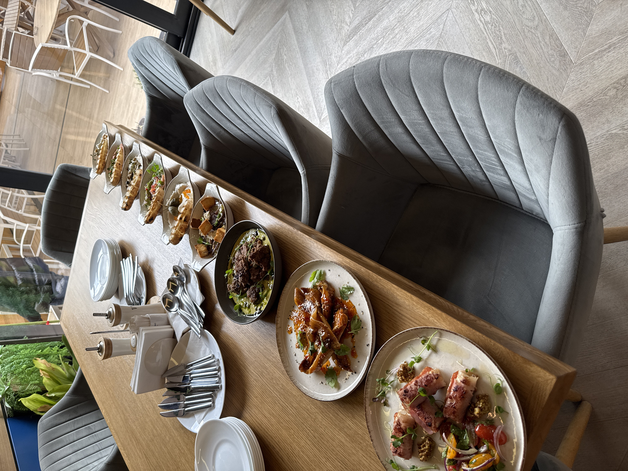 The image depicts an indoor dining area within a restaurant in Pleven, Bulgaria. A long, rectangular light-oak wooden table dominates the center, set with multiple dishes and place settings. On the left side of the table, stacks of clean white circular plates are present alongside neatly arranged cutlery (knives, forks, spoons) on smaller white plates. A white ceramic napkin holder containing white paper napkins is positioned with two ceramic condiment shakers with wooden tops. A variety of food dishes are spread along the table from foreground to background: 1. A foreground white circular plate holds four pieces of what appear to be grilled or pan-fried bacon-wrapped items, garnished with microgreens and dollops of granular mustard, accompanied by a side salad of diced tomatoes and red onions. 2. Next to it, another white circular plate contains several pieces of food coated in a glossy, amber-colored sauce, garnished with fresh cilantro and black and white sesame seeds. 3. Further along, a dark grey or black circular bowl contains a dish with a dark, textured meat or vegetable mixture in a thick, light-green sauce, topped with microgreens and dark specks. 4. A linear arrangement of six small, elongated white serving dishes, commonly used for appetizers, runs along the table. These contain various items including toasted bread with a white dip and a green garnish, a fresh salad of diced tomatoes and greens, and other preparations involving bread with different toppings. 5. Towards the background, a larger white serving platter holds additional food items, including what appears to be croutons or bread pieces with a dark mixture. Six grey velvet upholstered dining chairs, featuring vertical channel stitching, are visible along the right side of the table. The floor is light-toned, with a herringbone pattern. Large windows in the background reveal an outdoor patio area equipped with light wooden tables and white-framed chairs. A blurry figure of a person in a dark jacket is partially visible through the window, suggesting movement outside the establishment. A blue wall section and a green wall decoration with artificial foliage are visible on the far left. The scene is set, indicating preparation for a meal, with no individuals actively present at the table.