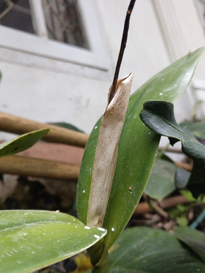 A close-up captures an orchid plant. Predominantly green leaves frame a tan, dried sheath from which a thin, dark stem emerges. The leaves have faint white speckles and minor blemishes. A blurry background reveals a window frame and glimpses of a wooden structure among the surrounding foliage. The scene is naturally lit.