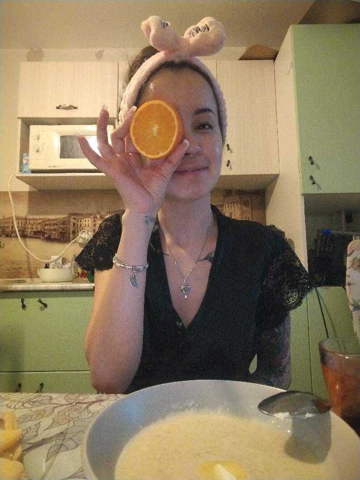 The image depicts an indoor kitchen setting located in Noviy, Russia. A female subject, with dark hair tied back, wears a pink fuzzy headband and a dark V-neck top with lace sleeves. She has light-colored fingernails, a nose piercing on her right nostril, a silver necklace with a heart pendant, and a silver bracelet with a leaf charm on her left wrist. Tattoos are visible on her left forearm and right upper arm. She is positioned centrally, holding a cross-sectioned orange slice with her left hand, obscuring her left eye, and displays a slight smile. In the immediate foreground, a table covered with a light-colored tablecloth featuring a subtle leaf pattern is present. On the table, a light-colored bowl contains a pale yellow, creamy substance with a square of light yellow solid (possibly butter) floating on top; a silver spoon rests within the bowl. To the right, a brown-tinted glass with a dark liquid is partially visible, and to the left, a small piece of yellow fruit is present. The background consists of kitchen elements: light-colored upper cabinets, a white microwave oven situated on a shelf, and a backsplash area with wallpaper depicting an architectural scene with buildings. Green lower cabinets are visible beneath the backsplash and to the right of the subject. A white electrical cord runs vertically along the wall to the left of the microwave.