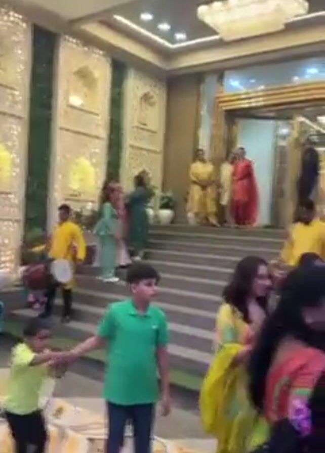 The video captures a lively gathering, likely a celebratory event, with people dressed in colorful clothing. Several individuals, including children, are visible, and some are seen dancing and embracing. There are musicians with drums on a staircase that leads to an open doorway with a golden frame. The surrounding decor appears to be ornate, with a backdrop of greenery and decorative elements. The atmosphere is energetic and festive.