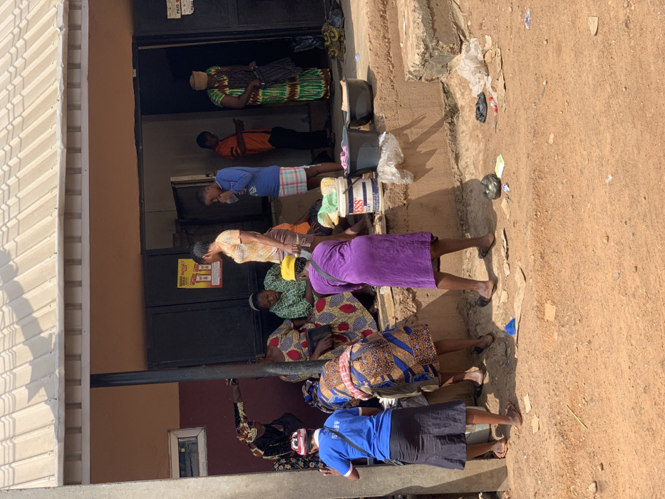 The scene is a street corner in Ondo, Nigeria, located at 7.251 latitude and 5.196 longitude. A group of people, mostly women, are standing in front of a building with a brown and white tiled roof. The building has a large doorway and a window. The people are gathered around a few buckets and plastic bags. One woman is wearing a purple dress and is standing next to a bucket. There are some scattered plastic bags and other debris on the ground. The people are standing on a concrete step, and the ground in front of the step is dirt. There are signs on the building, but they are not legible. There are several people standing near the entrance to the building. The people are all wearing clothes that are typical of the region. The weather appears sunny and warm.