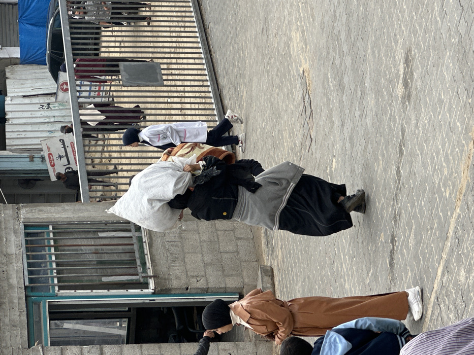 An outdoor scene depicts a paved area adjacent to a concrete block building and a metal gate. In the center, a person, viewed from the back, carries a large, white, irregularly shaped bag on their head. This individual wears a black top, a grey garment tied around their waist, a long black skirt, and dark footwear. A folded, patterned blanket or textile is carried in their left arm. To the left, a person in a light brown trench coat and black headscarf stands, partially cropped, wearing white sneakers. In the background, beyond a tall metal sliding gate, a person in a white lab coat and black headscarf walks right, carrying a folded brown textile. Further beyond the gate are several indistinct figures, including one in a dark uniform on the far right, a black vehicle, and a blue tarp. A sign reading "صيدلية" (pharmacy) in Arabic is visible above the gate. The building to the left features a window with vertical metal security bars and a doorway. The ground is paved with interlocking grey blocks. The location is in the city of Unknown, Unknown.