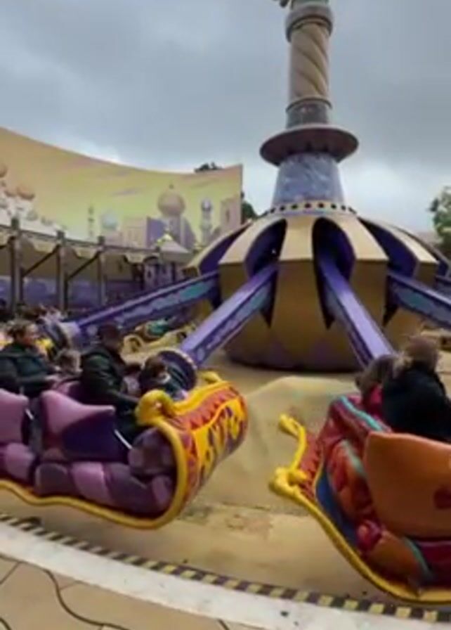 spinning ride at a theme park. The ride is designed to look like flying carpets, each with two seats, spinning around a central structure topped with a genie's lamp. People of various ages are riding, some in pairs. The area around the ride is themed with a sand-colored ground and a backdrop depicting an Arabian-style city. The sky is overcast. The camera angle is slightly low, capturing the movement of the ride and the people enjoying it.