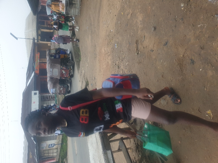 A person with dark skin walks on a street near buildings. They wear a black T-shirt, shorts, and sandals, and carry a blue and red bag over one shoulder and a green shopping bag. The street has an uneven, dirt surface. In the background, there are buildings, some with visible storefronts, and a few vehicles parked along the road, including auto rickshaws. The scene appears to be a busy commercial area in daylight.
